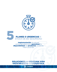 Entendemos que cada industria tiene ciclos de producción diferentes y, en ocasiones, los imprevistos pueden afectar la continuidad operativa. Por eso, te ofrecemos la posibilidad de implementar planes de surtido y stock de seguridad personalizados, basados en el consumo mensual de tus productos. Esto garantiza que siempre cuentes con los insumos necesarios para mantener tu operación en marcha sin interrupciones.